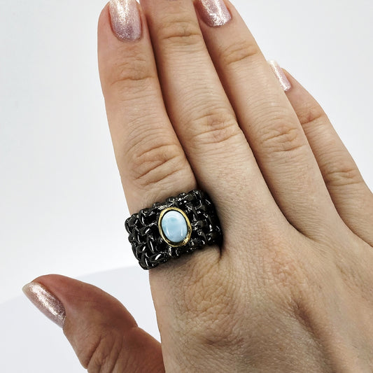 Black Rhodium Coated Silver Ring With Larimar, Size 8.5