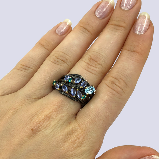Floral Inspired Sterling Silver Ring With Tanzanite, Blue Topaz And Blue CZ, Size 7.5