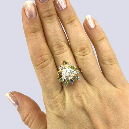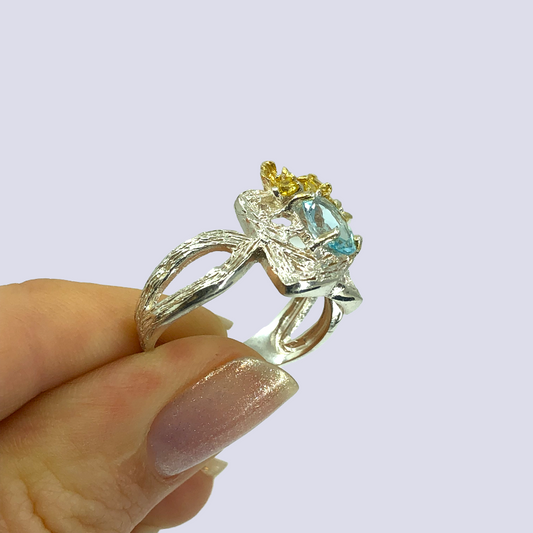 Floral Inspired Sterling Silver Ring With Blue Topaz And Citrine, Size 8.5