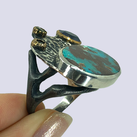 925 Oxidized Silver Ring With Turquoise And Other Gems, Size 8