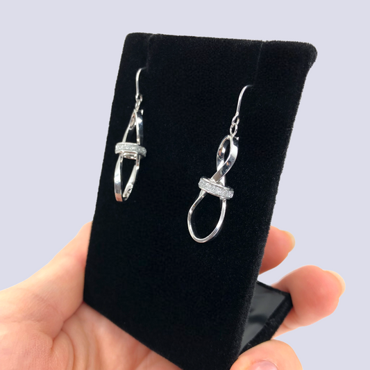Solid 14K White Gold Twisted Infinity Dangle Earrings With Stardust Accent