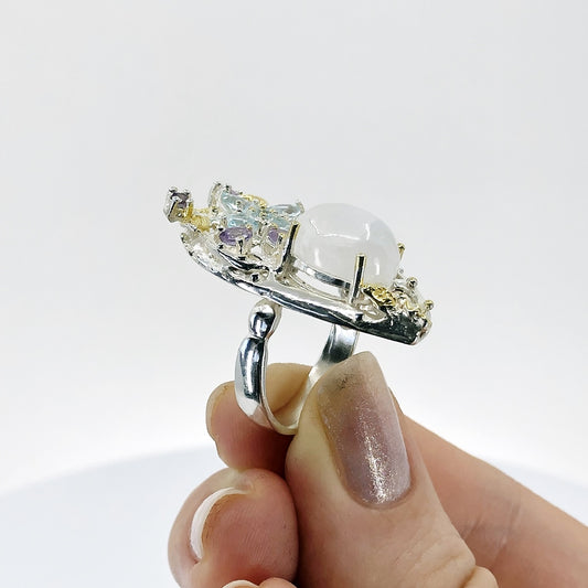 Moonstone, Blue Topaz and Amethyst Sterling Silver Ring, Size 7