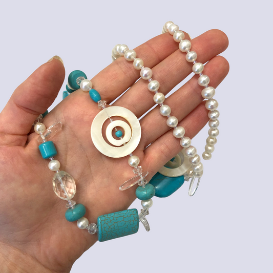 Aquatic Necklace Featuring Pearls, Mother Of Pearls, Turquoise and Beads, 38"