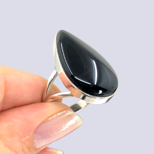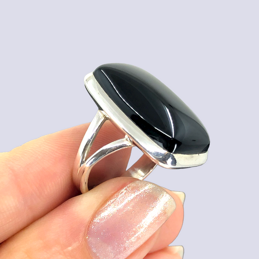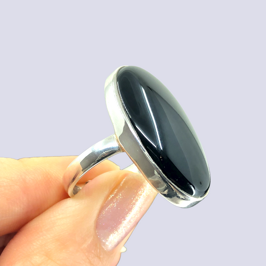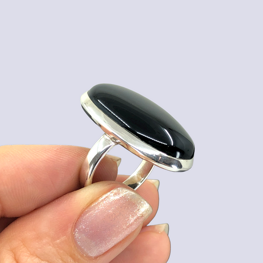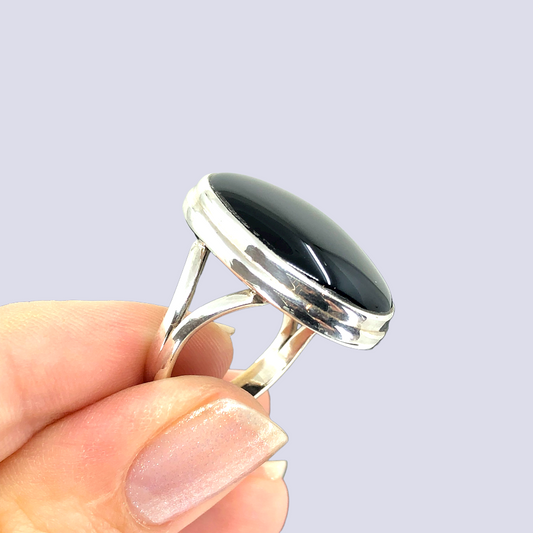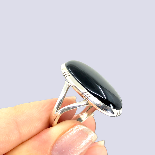 Sterling Silver Ring With Big Oval Black Onyx, Size 10.5