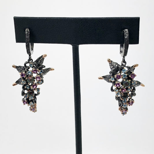 Grape Vine 925 Sterling Silver Earrings With Opal, Rhodolite Garnet And Blue Topaz