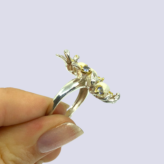 Floral Inspired Sterling Silver Ring With Opals And Tanzanites, Size 7