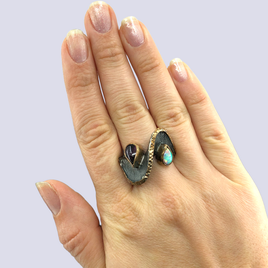 925 Oxidized Silver Ring With Pink And White Opal And Amethyst, Size 8