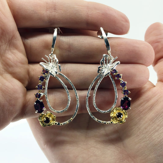 Amethyst, Garnet and Rhodolite Oxidized Silver Earrings