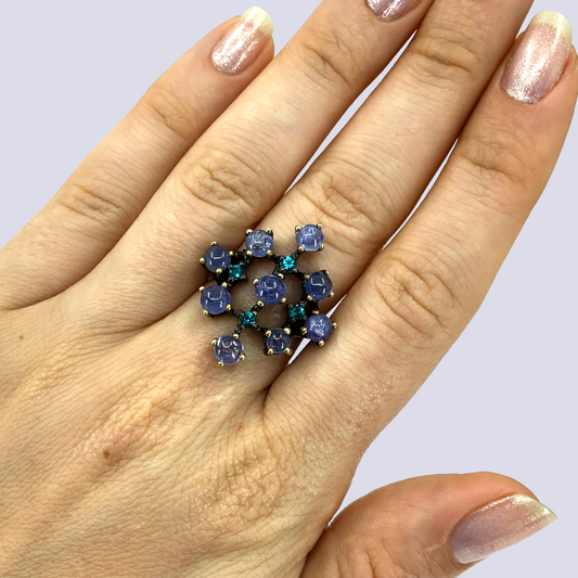 Floral Inspired Sterling Silver Ring With Tanzanite, Blue Topaz And Blue CZ, Size 7.5